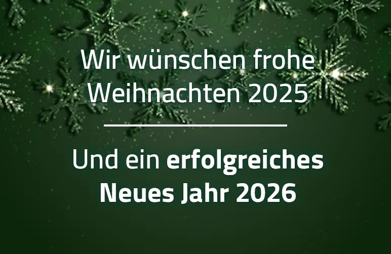 Wir wünschen Ihnen eine ruhige und besinnliche Weihnachtszeit, erholsame Feiertage sowie viele schöne Momente mit den Menschen, die Ihnen am Herzen liegen. Für das Jahr 2026 wünschen wir Ihnen Gesundheit, Erfolg und viele neue spannende Projekte.